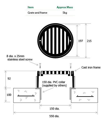 - Provides stormwater collection to 150mm drains (fits 150mm PVC collar)