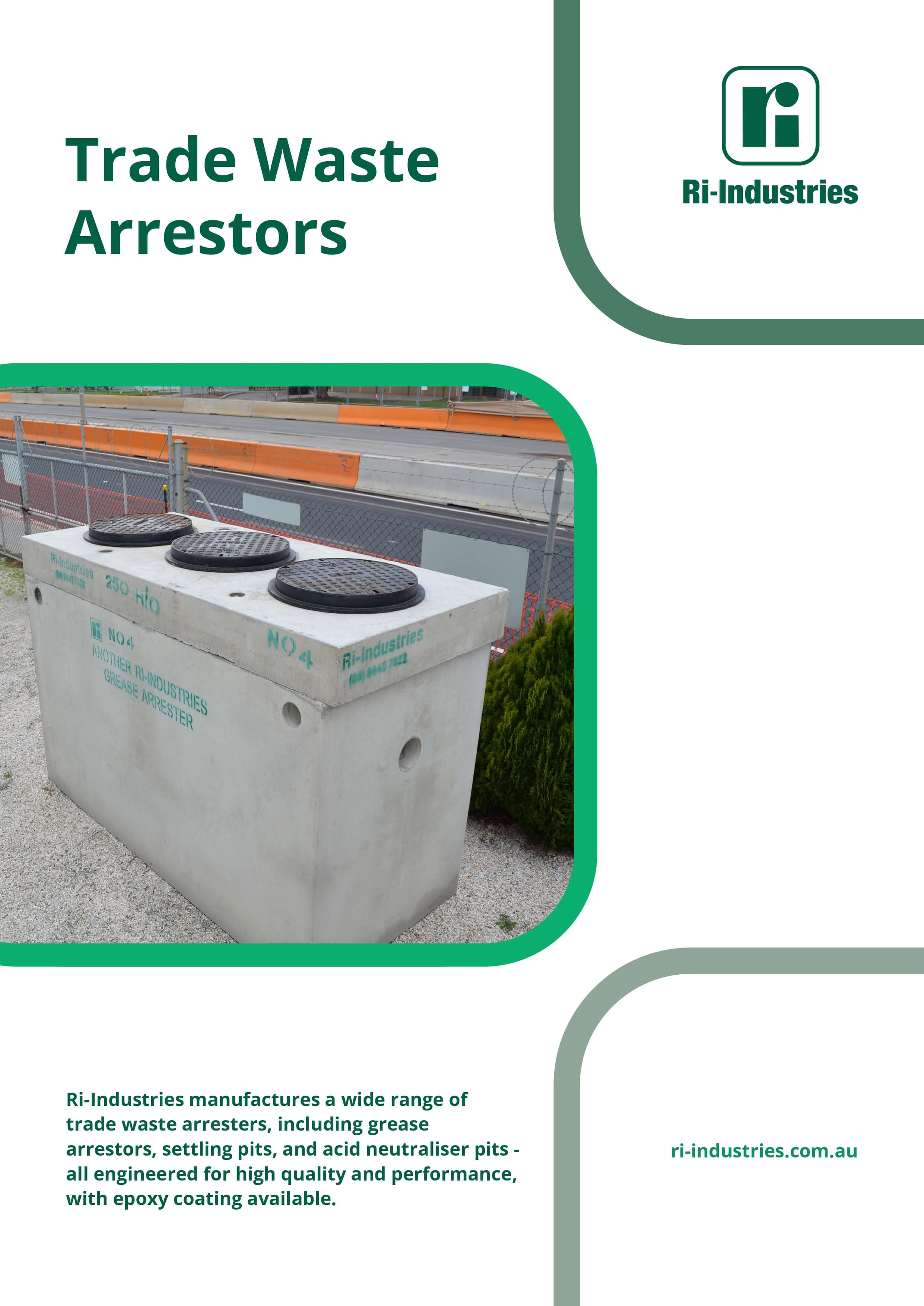 Trade waste arrestors are made of precast concrete with a strength in excess of 40 MPa at 28 days. Standard arrestors are complete with 6mm galvanised floorplate lids. Gas-tight lids set in precast concrete can also be supplied, as well as extension risers.