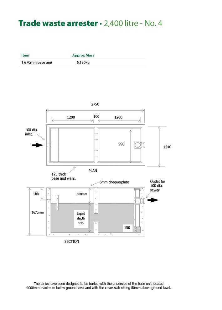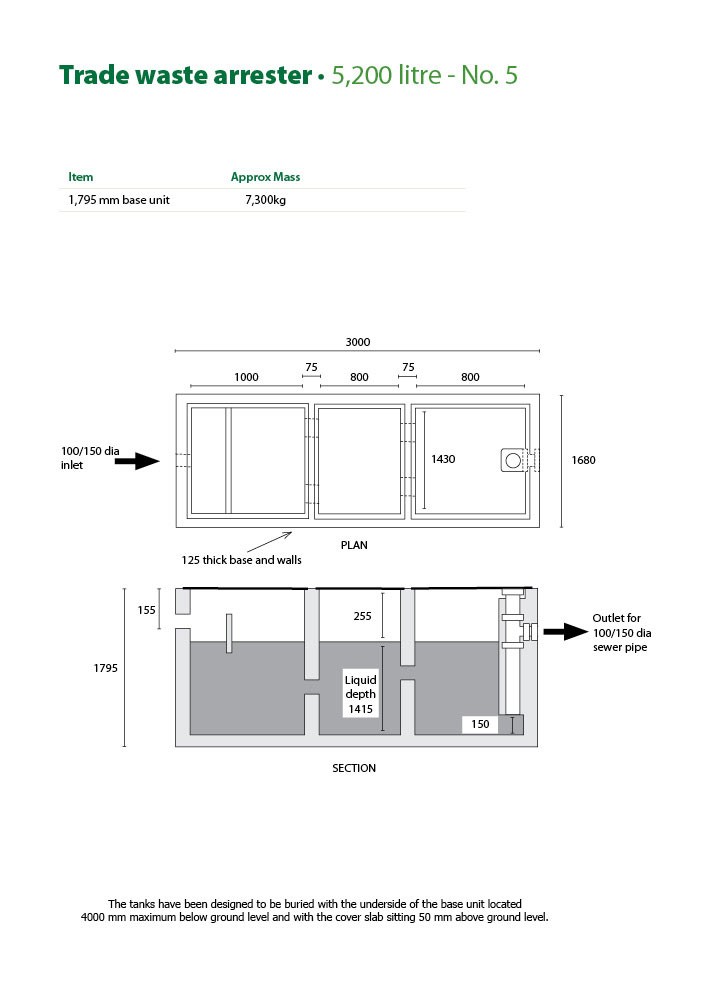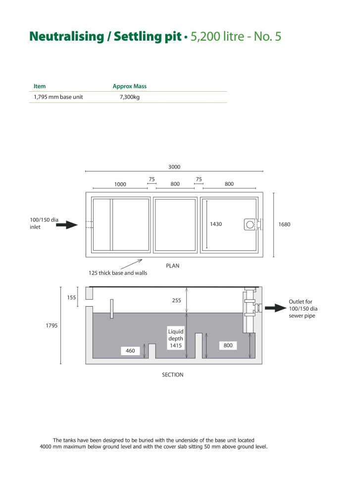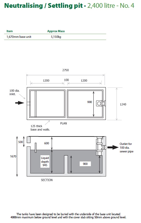 - The No. 4 and No. 5 tanks have been designed to be buried with the underside of the base unit located a maximum of 4,000mm below ground level and with the cover slab sitting 50mm above ground level.